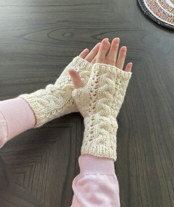 Construction: Gloves are worked top down, seamlessly, in a cable and lace design. The thumb is casted on and worked together with the palm and necessary decreases.
