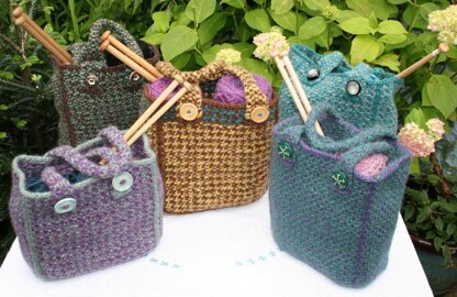 Ferla is knitted in one piece from the base up using a slip stitch pattern in two colours to produce a tweedy effect. The two handles are knitted first and then sewn in place. The buttons at the base of the handles are optional but I love vintage buttons and think they finish it off perfectly. the bag is knitted in the round using knit and slip stitches and then gently felted/fulled.
