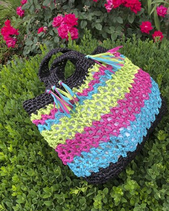 Bright and breezy, this summer tote will carry your summer essentials in style. A solid single crochet base worked in the round is topped by colorful mesh stripes. A bit of fringe adds whimsy—add more or less according to your taste.