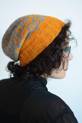 The sample was made with Tyrrell DK by Martin’s Lab. Shown in colorways Autumn in Poland, MC; and Tabby, CC.