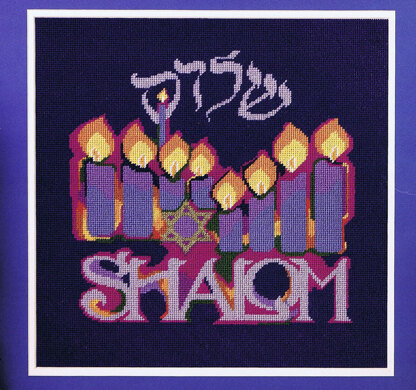 By Nancy Rossi. The solemnity of Jewish culture and tradition are depicted in this lovely, glowing menorah design. The Star of David is presented front and center and the traditional Hebrew greeting of shalom is featured. This design could be made into a Tallit bag or matzoh cover in addition to making a lovely picture or pillow.