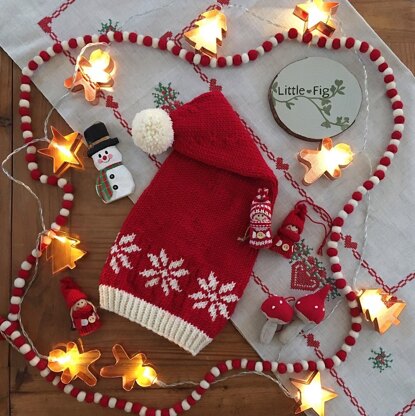 This hat is knitted in the round, from the bottom up. There is a snowflake fairisle section, with a chart provided in the pdf.