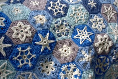 This wintry blanket is made from 12 different designs using a palette of 6 colours. The PDF pattern contains 12 snowflake hexagon patterns ranging from Easy to Advanced skill level. There are four designs for each skill level and all special stitches are explained in the pattern.