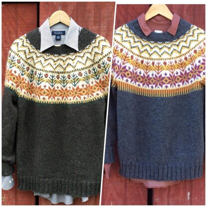 Festive Woodland Pullover is inspired by traditional Scandinavian circular yoke sweaters and timeless colorwork motifs with a modern color palette. Another inspiration was Woodlands and mountains, as well as geometric patterns. Unisex in style, this pullover is perfect for men and women.