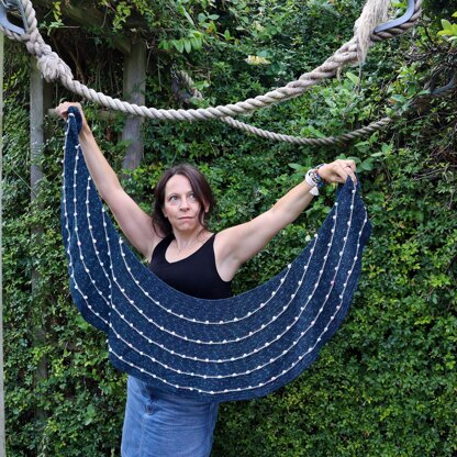 Festoon is a large, two-colour, heart shaped crescent shawl, with rows of popcorn stitches scattered throughout inspired by strings of twinkling lights on a dark night.