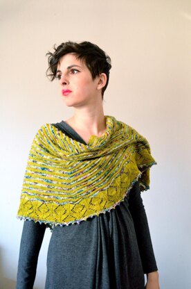 Feyre is a semi-circular shawl named for the lead character in Sarah J. Maas’ A Court of Thorns and Roses. The shawl features stripes with just a touch of texture and a lace border reminiscent of the eternal blossoms of the Spring Court where Feyre finds her destiny. Knit with two skeins of fingering weight yarn, this shawl is a perfect option for showcasing beau- tiful hand-painted yarns. Feyre is knit from the center out and is finished with a romantic and playful picot bind off. Instructions for the lace are both written and charted.
