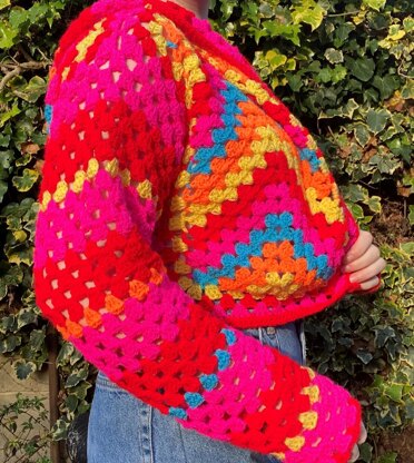 The pieces are joined as you go, so there’s no seaming afterwards. The sleeves are worked in the round downwards from the shoulder to the cuff. The hood is worked upwards in one piece and there’s a short seam to close the top of the hood. This seam is worked in ss and can’t be seen, even when the hood is down. This pattern is great for using up yarn scraps.