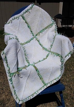 The 2-Color blanket has mitered squares of garter and a contrasting color border around each square with tendrils in the borders.