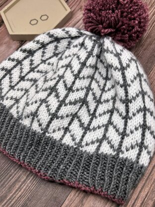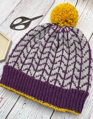 This proposal includes a modern colorwork hat design featuring an angular arrow shape and fun contrasting color details.