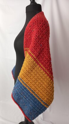 I like to think of an aran shrug as a wearable blanket. This one is worked in Tunisian crochet, and I’ve included some texture in the form of small stars, with blocks of colour to add interest. The shrug is made in one piece, a large rectangle, which is then folded in half along its length and joined at the ends to make cuffs. The shrug has a honeycomb stitch border to prevent curling, and is finished with a simple double crochet (US single crochet) edging. Pattern is written in English and uses UK terms.