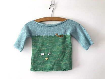 This Field & Sky Pullover sweater is knit flat then adorned with your favorite farm animal buttons. The two-color design allows you to personalise your creation without the effort of intarsia or stranded colorwork. I chose cow, chicken, rabbit, and carrot buttons, but you could select buttons depicting tractors, birds, pigs, or just about whatever the wearer is fond of. The sleeve length should land just below the elbow, keeping it from being dragged through ketchup and letting a long sleeve tee or shirt layer catch the dirt instead. The wide neck opening means no struggling. The sample shown was knit by Clare Hamill.