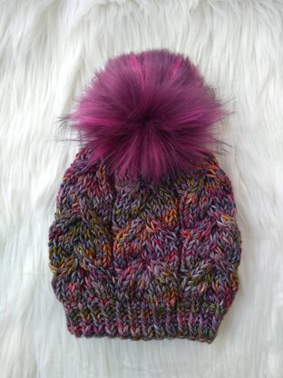 Pattern is written for one weight, bulky, but as you can see, all sorts of yarns can be used to create this beautiful hat. It is an advanced beginner to intermediate pattern, simply because of the cables, but the construction is quite straightforward.