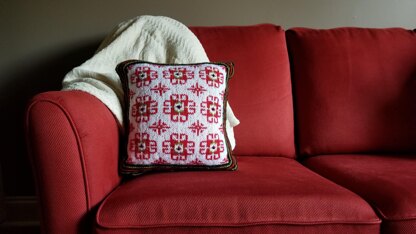 Fiesta features a bold Southwest motif and a fun summer twist on the classic complementary combo of red and green. The Fair Isle top is worked in two colors and then embellished with duplicate stitch and French knots. Stripes add zing to a mitered garter stitch border while the back is worked in simple stockinette stitch. The pattern is fully charted, including the embroidery. A fast, engaging project in lively colors, perfect for warm-weather knitting; but the fun doesn’t have to take a ride when winter blows in! Keep the pillow in its place on the bed or in a favorite chair whatever the celebration— Fiesta brings a unique, stylized pop of color to any home’s Christmas trimmings. Four-season décor has never been so effortless. (Sample shown knit in Knit Picks Brava Sport.)