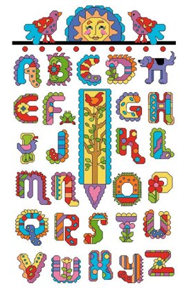 Designed by: Linda Gillum. Lovers of folk art with a South of the Border, colorful theme will love this stunningly vibrant alphabet. Bright letters with graphic patterns give it a whimsical Mexican charm featuring an artful sun! Make a name sign for a kids room or Welcome Friends sign for vacation home. A perfect companion to our South of the Border Sampler.\n