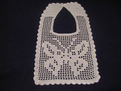 This is a beautiful bib which can be made in two ways. Charts have been provided for both filet crochet or regular bib with color work contrast for the butterfly, or cross stitch overlay. The filet is done in size 10 crochet thread, while the color work is done in 100% worsted weight cotton.