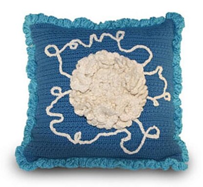 Materials Front: 300 yards medium worsted weight yarn in blue, or yarn color of your choice (for 14 x 14" (35.5 x 35.5 cm) pillow). Back and Ruffle Trim: 385 yards medium worsted weight yarn in turquoise, or yarn color of your choice (for 14 x 14" (35.5 x 35.5 cm) pillow). Flower: 200 yards light worsted weight or heavy DK weight yarn in off white. 14 x 14" (35.5 x 35.5 cm) pillow form, or size of your choice. Large embroidery needle 5.0 mm crochet hook 4.5 mm crochet hook 4.0 mm crochet hook