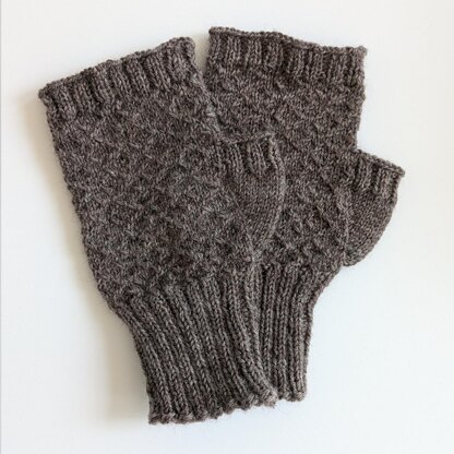 Knit with sock/fingering weight yarn, these finely knit fingerless gloves feature a ribbed cuff and fingers with a lightly textured diamond pattern created with simple cable stitches. With minimal cabling, these gloves are very stretchy.