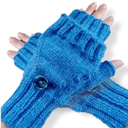 These knit finger less mitts have knit ribbing along the top and bottom of the mitten as well as along the bottom of the flap. A button holds the flap in place when not in use. This is a beginner knitting pattern using only simple knit stitches and techniques.