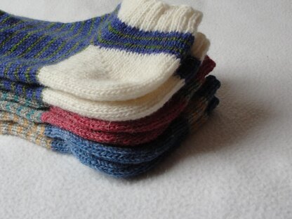 Comfy striped sock knitting pattern for fingering weight yarn. Sock pattern for adults/teens. Seamless styled toes and heels. Quick and easy little accessory. A fun and useful way to use up small bits of yarn.