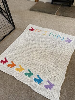 I created this blanket for two of my close friends who have just had a gorgeous little boy. There’s a garter stitch border, colour work rabbits and a repeating structural pattern. I used the intarsia method when knitting the rabbits but you can use any method you prefer. I then used duplicate stitch to add in the tails on the rabbits and name. Once blocked, the blanket measured 87cm by 92cm - this is easily adjustable and tips on how to alter the length/width/design included. I have included a chart of letters and a blank chart of the right size for you to create individual names to add onto the blanket - please email me if you need any help with this. The gauge doesn’t really matter in this project so you could use any yarn you like – this will alter the final size and yardage. I used Drops Paris (50g/75m) - 485g/730m , main colour 17, others 5/10/11/12/13/14 (<10g each) & Sirdar Snuggly Bunny (50g/90m) -1 ball, <10g. These aren't available on here so I have added an alternative yarn.