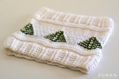 Original knitting pattern for textured knit cowl scarf with adorable Christmas trees ornament, that makes up quickly due to thick chunky yarn. Unisex design, excellent accessory for cold weather, great easy to make DIY Christmas gift for women, men and children!