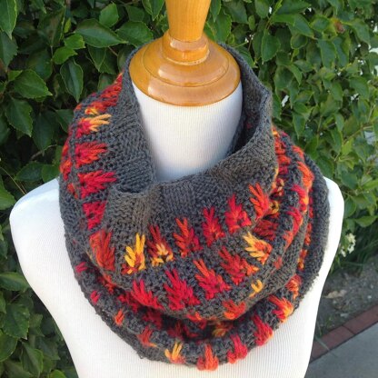 This is a nice slip stitch design, and I chose the colors to represent flames in a bed of ash. Would also look intriguing with other color combinations. Cowl is long enough to wrap twice nicely around neck for extra coziness.