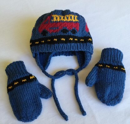 Fire Trucks Ear Flap Hat & Mittens to Match knitting pattern in PDF format is sized for ages 18 months - 4 yrs with a finished circumference of 18-20”