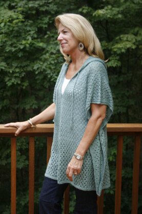 This poncho is knit in one piece from the bottom front to bottom back with instructions for front tab and neck opening along the way. Stitches are later picked up at the neck opening for the hood. The top of the hood is finished with Kitchener stitch. Braided ties are added at the neckline edge and poncho sides are partially joined by tacking together several inches in from the side edge.