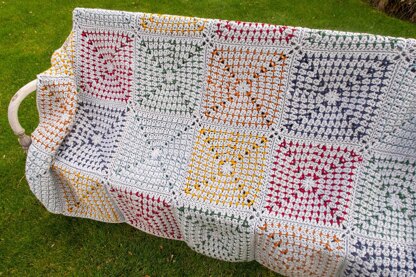 This blanket is worked in squares which are then crocheted together (no sewing required!). Each square is worked in 2 colors from the center out.