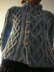 The Fireside Sweater is a shawl-collared cabled cardigan. The overlapping center cable continues through the dramatic shawl collar. Smaller cables along the sides accent the larger cables in the middle containing the buttons and buttonholes.