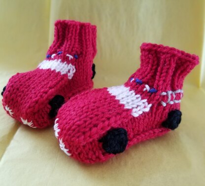 Yarn used: Cascade 220 superwash in red and white. Accents include: gray, black in yarn or floss. Embroidery required for finishing. Knit flat with written pattern directions. Medium worsted can also be used for slightly larger finished booties. I use a knit tire design, you can also embroider the tires using the circular spoke design used for the headlights