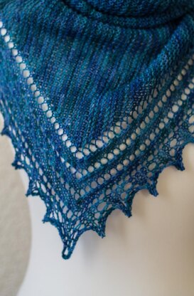A sideways shawl designed with hand-dyed variegated sock yarn in mind – a mixture of stockinette, garter stitch and clean lace lines breaks up the colours and helps to minimise pooling.