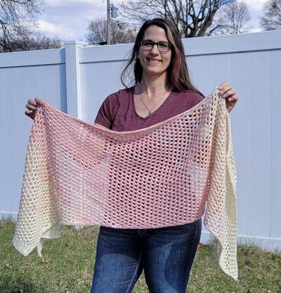 A subtle color change from cream to speckles to pink and then back again brings to mind the blush of innocence on a first date or a first kiss. This piece is delightfully lacey, yet warm and squishy as it is knit holding two strands at a time throughout. The shawl is worked on a bias using increases and decreases on each right side row. The main body has an easy to memorize stitch pattern that is a six row repeat. With twisted rib on both ends and an easy slipped stitch edging on the sides, you’ll have a finished shawl in no time!