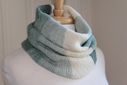 This modular garter stitch cowl is knit in multiple directions. The rectangular shape is gathered by decreasing before joining in the back. Stretchy garter stitch means it slips over your head easily but still stays close to your neck to keep you warm!