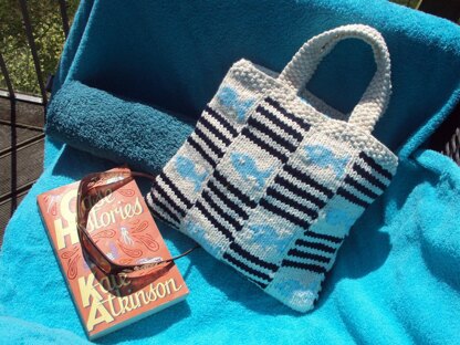 A beach bag with a fish motif and stripes in cotton aran. Size 28 cm wide x 25 cm deep. The top is finished in moss stitch, with moss stitch handles. The rest is stocking stitch. Simple motif for intarsia. Part of a range of home knits inspired by the seaside.