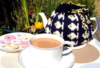 A fairisle tea cosy with fish motifs at the front and stripes at the back. The bottom and top are garter stitch, with a plaited tie to fasten. Measures 23 cm wide x 17 cm to tie. An easy fairisle for anyone who has just learned the technique. The eyes are embroidered. Part of a group of seaside inspired knits for the home.