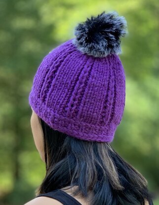 Chunky and Bulky yarns have never been so beautiful as now. Big stitches in amazing colors and wonderful stitch definition. The brim is two Vikkel Braids with 1x1 rib in between. Simple wide rib bands separated by 1/2 Fisherman’s rib columns. Knit it in one sitting. Faux fur pom poms are so readily available and save the time and yarn used to make pom poms. A week of knitting nights can produce amazing Holiday gifts. There is plenty of negative ease in this bulky hat.