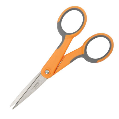 Comfort and precision in one little scissor. Orange and grey handles. Snuggle into a cozy, cuddly pair of scissors. Unexpectedly comfortable, with the same excellent function as always, these softgrip handles make cutting easy and relaxed, bringing a new level of comfort to work.\n\nCaution: Sharp blade. Contact may result in injury. Handle with care and keep out of reach of children.