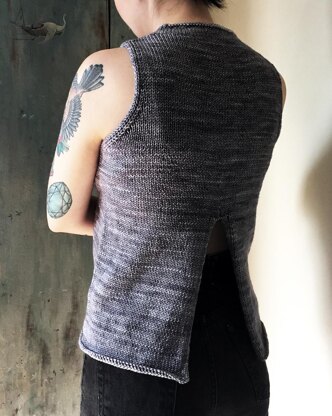 This simple sleeveless crew neck top with center back vent is the perfect staple for anytime of year. Knit in stockinette stitch, in our base yarn Work Sock, from the bottom up with minimal seaming at the shoulders, this is the perfect project to accompany you on the go.