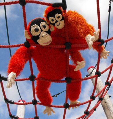 This is my knitting pattern for Fizz and Fuzz The identical twin baby orangutans. Although these baby orangutans are impossible to tell apart their knitting patterns are each surprisingly each quite different.Both Fizz and Fuzz are knitted mainly using my Superfast technique on 8 mm needles which is 4 times faster than ordinary knitting.Both Fizz and Fuzz are so quick and simple to make that they only took a couple of days to complete. They are both knitted in Ice Eyelash which is cheap and available to buy on line. You can buy the Fizz and Fuzz Identical Twin Baby Orangutans pattern on Ebay, etsy or from my madmonkey website www.madmonkeyknits.com. While there please read my latest blog to see what the twins and all the other monkeys have been up to. Thanks for taking a look.