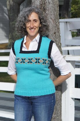 This casual vest has gentle waist shaping and a 3-color stranded pattern inspired by Southwestern tile work.