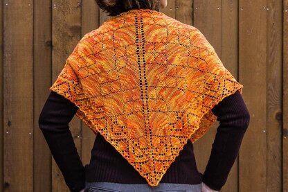 This is a traditional triangular shawl, worked from the center out in a pattern that resembles large and small flames. It was inspired by Mary Chapin Carpenter's song "A Keeper for Every Flame".