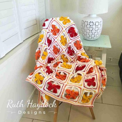 The Flame Tree Flower (Delonix Regia) centre is crocheted first with a magic ring, then the large flame petals are crocheted out of the centre circle. The small petals will be crocheted into the centre. Each large petal is 5 cm (2 in) in length and the small ones about 2 cm (1 in). The blanket pictured on the cover is made up of 80 squares.