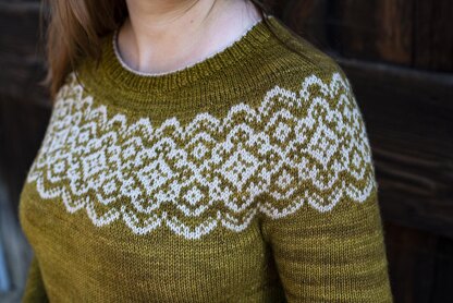 Inspired by Belgian Lace, this pullover features the stranded pattern on its round yoke that recreates the traditional bobbin lace band. This pullover is worked in the one piece from the top down with yoke shaping.