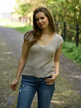 DESIGN OVERVIEW: Knitted with simple lacy stitches in linen yarn, this oversized top is designed with dropped shoulders, deep V-neck and boxy silhouette. Front of garment decorated with garter stitch panel in the centre, which transformed into neckband after starting of neck shaping. The recommended positive ease is about 10-20 cm/4-8 inches. Front and back of top are knitted separately bottom up on straight needles. The neckband is knitted together with front and sleeve bands are knitted on the go.