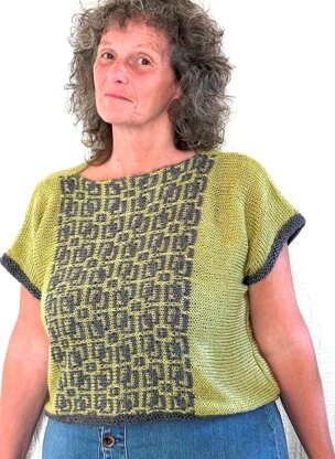 The top is worked in 2 pieces which are each worked sideways from under one arm to under the other arm. A central pattern of mosaic knitting is worked on the front piece. Once the 2 pieces are seamed across the shoulders and down the side seam, stitches are picked up and worked in garter stitch around the armholes and the bottom band.