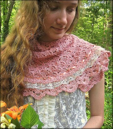 It is a shawlette (but can be made larger), with shaping for Faroese shoulder-hugging. To change things up a bit (and show off in front of its sister-patterns), Fleur has a ruffle and a sewn-in lace insert; ribbon and rosettes too, of course! But you can leave all this frippery out if you wish - instructions are provided to make the edging without the lace insert...