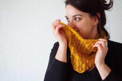 Fleurs sauvages shows off a delicate but easy to remember lace pattern. It is worked in the round and features a scalloped bottom and a rolled top edge. Snuggling cowl and infinity scarf sizes are available.