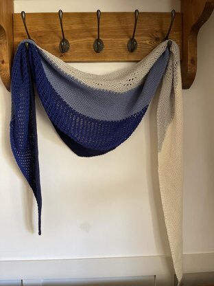 Flick of the Wrist is an asymmetric shawl which is designed to go with a 5 colour pack of yarns. The main sample was knitted in Milla Mia Naturally Soft (100% Merino Wool) which is a sport weight yarn. Colour A: Snow 124, Colour B: Cloud Grey 127, Colour C: Rain 165, Colour D: Ink Blue 106, Colour E: Midnight 101 It begins with the lightest colour and finishes with the darkest.