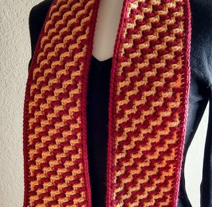 This striking scarf is easy and fun to make in the Mosaic Crochet technique. Mosaic Crochet is much easier than it looks! Two contrasting solid colors are used in the scarf, with only one color used in each row. Fringe is added at the short ends to finish off the scarf. The length and width of the scarf are fully adjustable, so you can make this scarf any size you desire using any yarn weight!